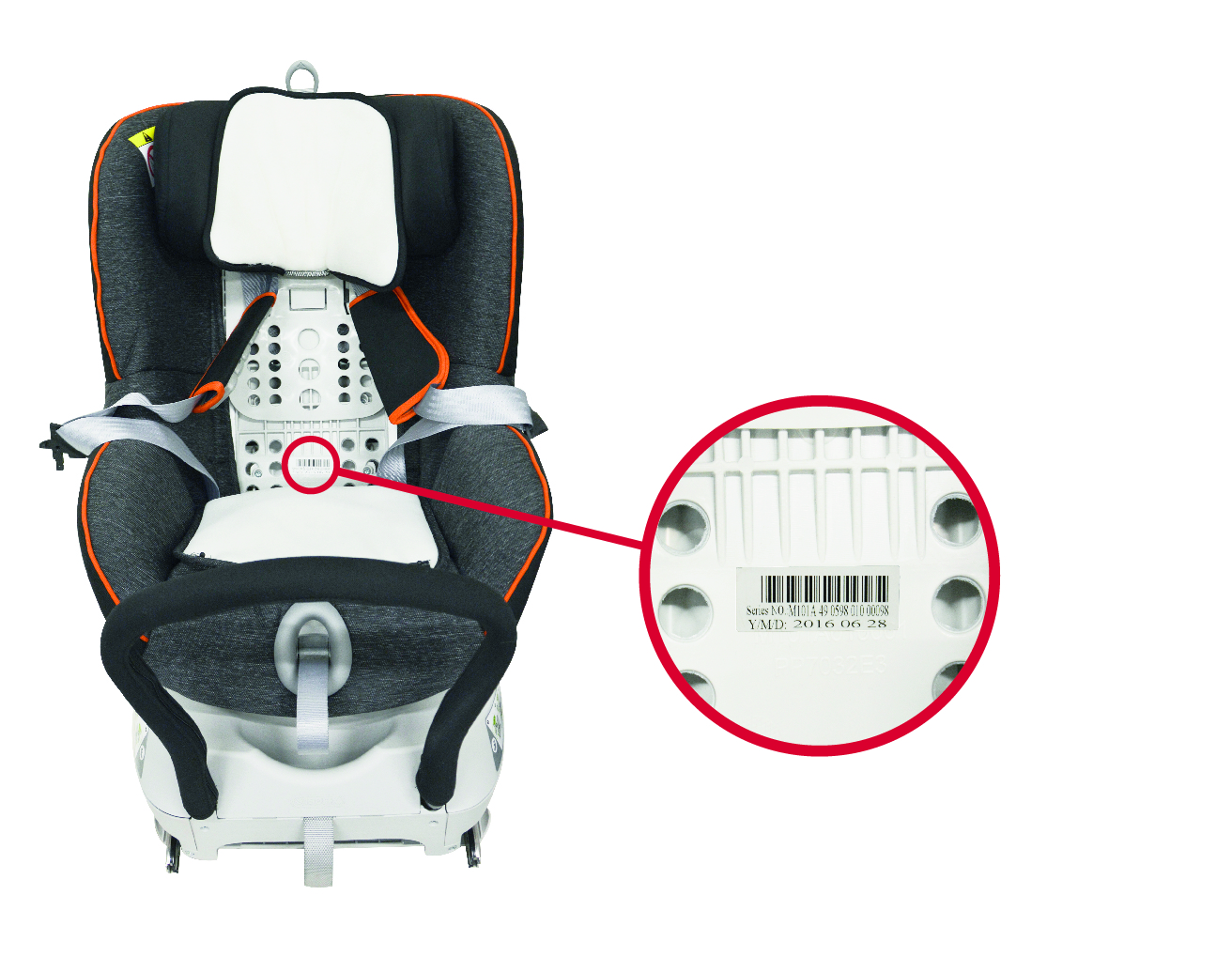 - 4. Sériové číslo je umístěno na skořepině sedadla.